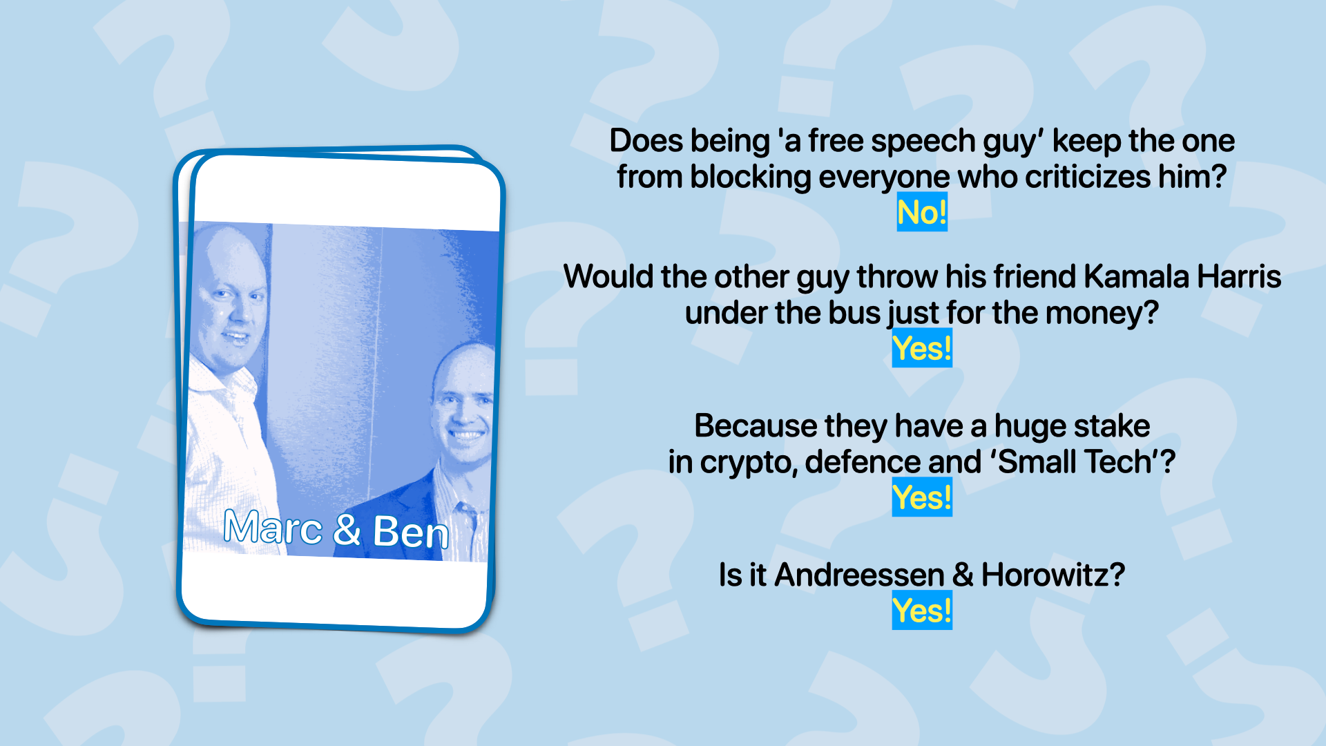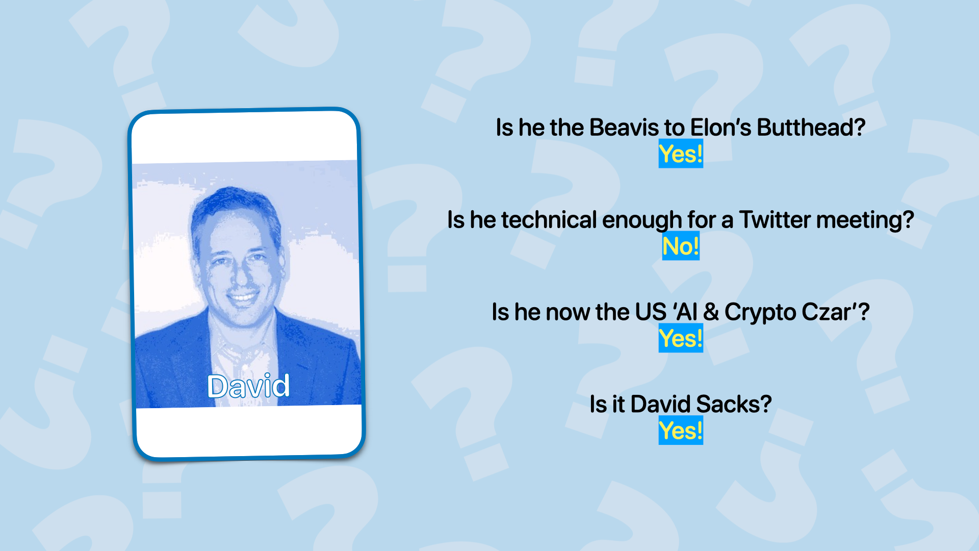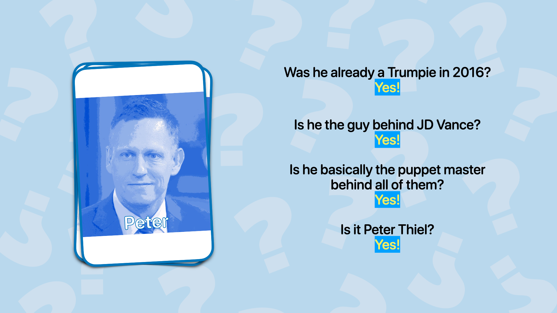The first isn't anything new. It's an oligarchy, but this time, it's with tech bros. I played a little game of Guess Who, introducing the audience to people like David Sacks or Peter Thiel. Already, we see influential tech people putting their pawns at key positions. A rich SpaceX tourist without any administrator experience as the head of NASA. A Palantir person as the Under Secretary for Economic Growth, Energy and Environment. The list will go on and on.